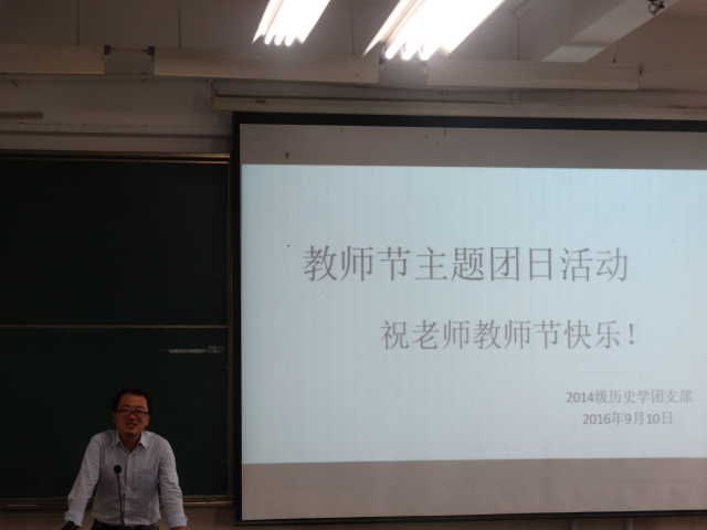 9月8日下午,14级历史学在2010501教室召开纪念教师节主题班会。班会由团支书吕永鑫同学主持,辅导员宫超老师应邀参加。班会伊始,班长吕永鑫上台代表全班向宫老师表达祝福和谢意,并赠送教师节礼物。紧接着,宫老师上台讲话,鼓励同学们积极参加教师从业资格证考试,承担起身为人师、教书育人的那份责任。做一名合格的师范生、做一名合格的人民教师。在一片掌声中,主题班会圆满结束。