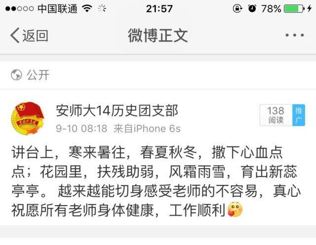 在教师节到来的当天,由2014级历史学团支部官方微博在牵头发表的教师节感恩寄语,引起了同学们的共鸣和踊跃参与,在微博上表达祝愿。同学们也纷纷拿起自己的手机,给自己的导师发送祝福短信,最为真挚的情感和动人的话语通过指尖的传递,让收到短信的老师们都有着最为温馨的教师节体验。