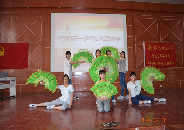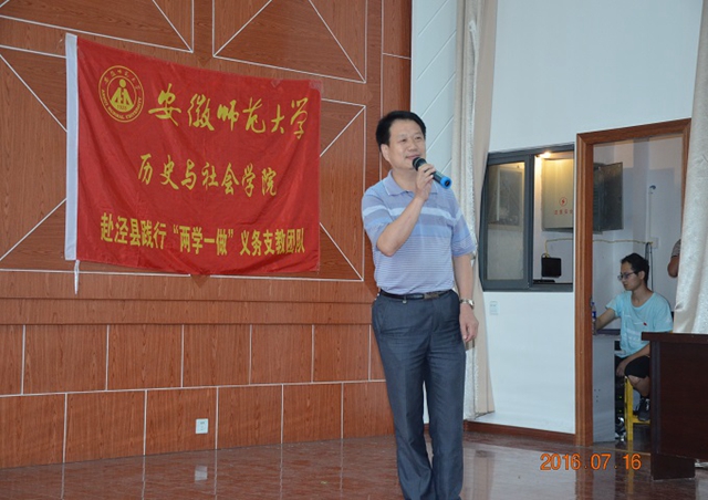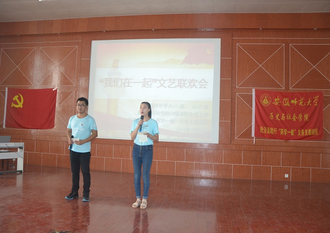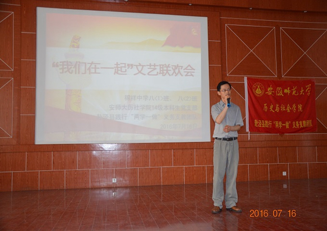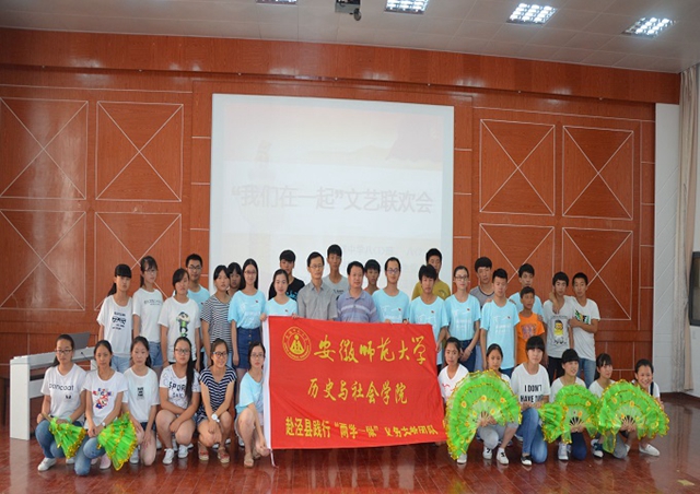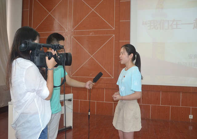 本网讯(历社公司 邓怡晨)一周的支教活动转眼即逝,社会实践以及将近尾声,7月16日下午,安师大历社公司14级本科生党支部赴泾县践行“两学一做”义务支教团队在稼祥中学阶梯教室进行本次社会实践活动的最后一项内容——举办“我们在一起”文艺联欢会,泾县电视台对此进行了全程拍摄采访,稼祥中学教育工会主席张少华、稼祥中学留守儿童服务中心主任郭世东、副主任莘国荣出席了本次文艺联欢会。