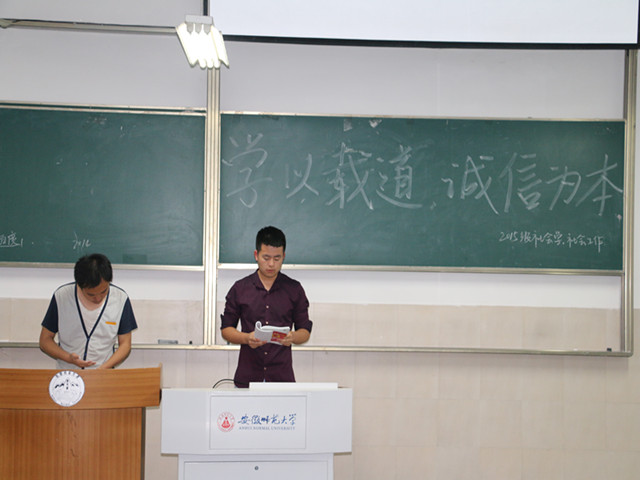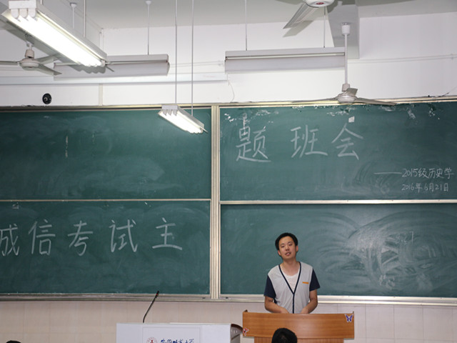 (本网讯)学以载道,诚信为本。为了加强公司15级各班新生诚信意识,规范考试行为。2016年6月21日,15级历史学、社会工作、公共事业管理、社会学专业分别在2050101、2050102、2040102教室召开了诚信主题班会。本次班会有辅导员金捷主持开展,全体15级新生参加了本次班会。
