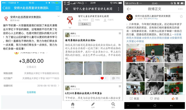 自暑期社会实践活动开展筹备以来,安师大赴岳西县宣讲及支教团队积极向社会爱心团体募捐,以期让岳西山区的孩子们得到更多的社会关爱和帮助。截至目前,该团队已经得到了天津商业大学红十字会、芜湖市延安小学、瀂港中学共计8000余元捐款,这些善款将全部用于对山区孩子的捐助。与此同时,为了加强实践过程中的安全性,该团队印发了安全须知,并给每个团队成员买了保险,以保障每个队员的安全以及实践活动的顺利进行。