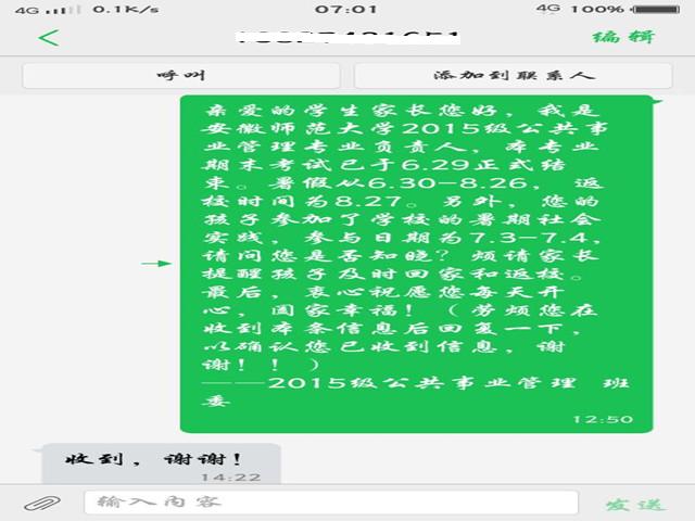 班会结束后,金捷辅导员向各班负责离校登记的班委了解离校登记工作进展,并查看了各班参加暑期社会实践员工的相关信息登记表。同时为做到“家校共建安全平台”,各班班委同学还在辅导员的布置下有效地分配任务,第一时间将放假等信息编辑成短信发送至各位家长手中,切实地让各位家长了解自己孩子的返校动态。
