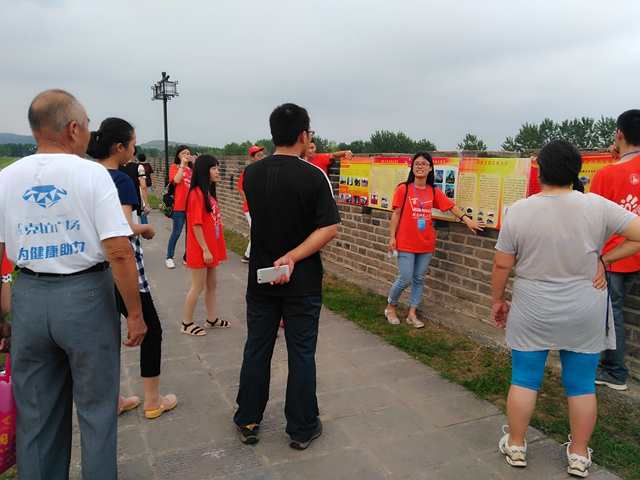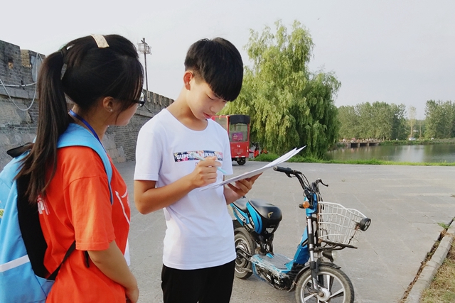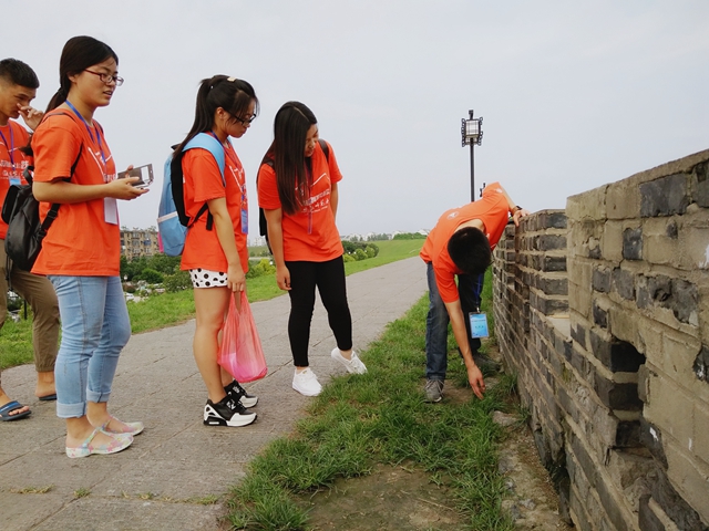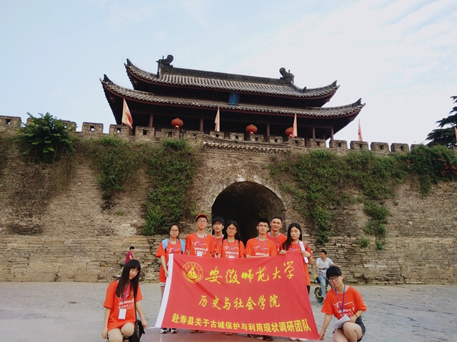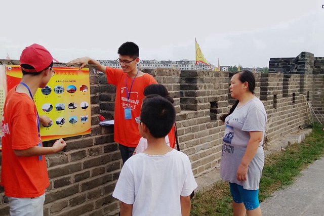 在上午的游览和调研之后,下午团队成员又来到了寿县东城门――宾阳门,这是迎接来使和宾客的门。远远望去,城楼上红旗飘扬,走近仔细一看,更感受到古城的威严和庄重。游览以后我们登上城墙,开展了我们的调研活动,我们一边发放问卷,听取着当地人对寿县古城保护与利用的看法,一边又听着古城上的人们诉说着古城的光辉岁月和源远流长的历史文化。与此同时,我们打开展板,有队员也介绍了其他的中华历史文化名城,宣扬出“传承中华文明,保护文化古迹”的活动内涵,体现了我们肩负历史使命的责任感,引起了群众的围观和好评。