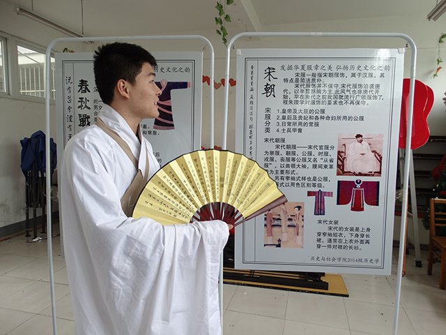 “汉服文化祭”分为汉服知识宣讲与汉服游行两个部分,汉服选举活动主要目的是让人们了解汉服的构成与变迁,由各个团小组推举出的两名宣讲人员共20人在二食堂广场,通过精心准备展板的讲述由商代至晚清的中国传统服饰知识,为前来观看同学们揭开了一幅长达千年的汉服变迁画卷。“汉服不是汉代的服饰,而是指汉民族的民族服装,要特点是交领右衽,束腰,用绳带系结,给人洒脱飘逸、端庄大方的印象。”宣讲队员李鹏云向路人介绍说。活动期间,同学们还积极的邀请前来观看的同学们一同合影留念,让众人参与其中,活动受到一致好评。