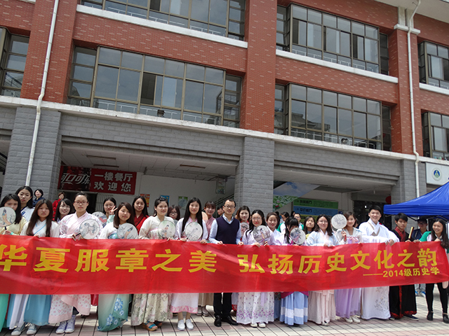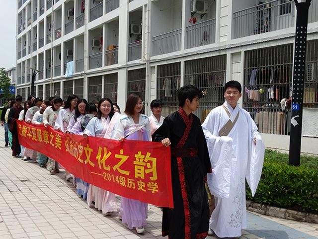 本网讯(14历史)有服章之美谓之华,有礼仪之大谓之夏。汉服作为古代汉族的传统服饰,传达着独有的优美气质与丰富的历史古韵,为了弘扬中华传统服饰文化,4月27日中午,2014级历史学在辅导员宫超老师与团支部、班委会同学的组织下,在英国正版365官方网站花津校区举办“汉服文化祭”活动。