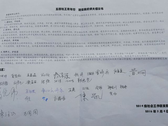 践行社会主义核心价值观是青年学子的实现人生价值的必由之路,随着一个个名字被同学们亲手签写在“建设美好师大”倡议书上面,同学们更深刻的理解到什么是践行五四精神。将各种规章制度铭记在心,付诸行动,做恒志笃行的有为青年。