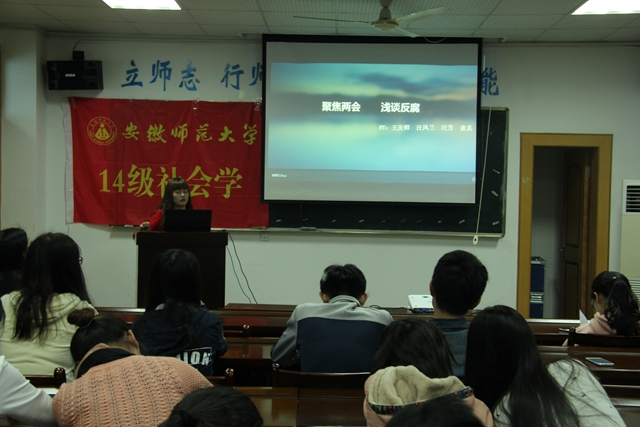 会上,首先团支书盛雨嘉同学带领同学共唱共青团歌,对两会由来的背景做了一个简短的介绍。尔后,入党积极分子和班级各团小组代表上台做“两会精神”报告。同学们就两会精神、十三五规划、精准扶贫、高校毕业生就业、反腐等一系列社会热点问题进行了探讨,并结合自身经历谈了自己的认识及感悟,引起了同学们的热烈反映。通过此次报告交流,同学们畅聊社会发展,积极关注国家大事,对两会有了更深刻的认识。