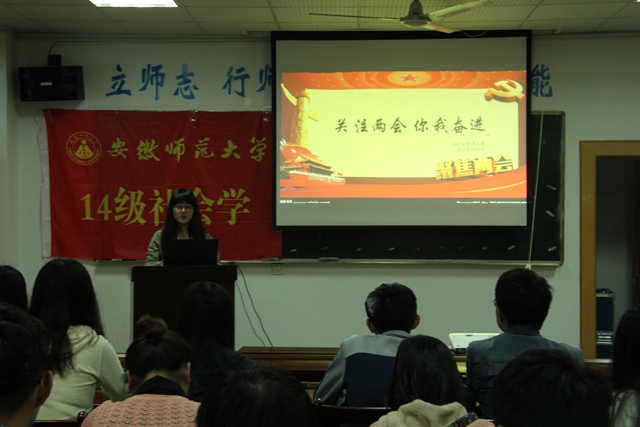 实践辅导员张雁老师在会上指出:作为社会学专业的同学应该具有社会和专业的敏感度,结合专业特色及自身体会,在学习和生活中去了解、认识和贯彻两会精神,把握时代脉搏,保持思想的先进性,成为有责任感的有为青年。
