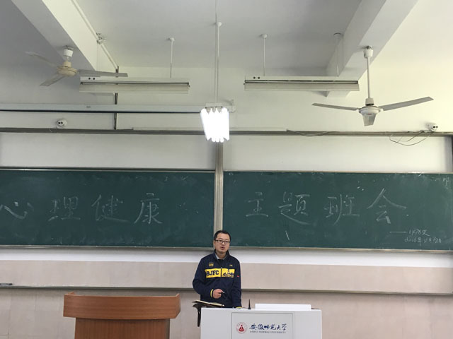 上午三节课后,主题班会准时开始。宫超首先向同学们简单介绍了近期班级工作状况以及发展党员的相关事宜。紧接着他向同学们讲述了近些年来因心理健康问题引发的大学校园里的突发事件,提醒大家务必要认识到心理健康对于当代老员工的重要性,并希望同学们时刻关注心理上的细微变化,及时疏导,保持一个积极健康的心理状态。随后班级心理委员李慧慧同学上台,带领大家学习公司二级心理辅导站印发的《轻松面对抑郁情结》知识手册,讲述关于心理健康问题的相关知识。李慧慧同学最后向同学们公布了公司心理咨询室的预约方式,并表示自己愿意做所有同学的知心朋友,随时欢迎大家找她聊天。在一片掌声中此次主题班会圆满结束。