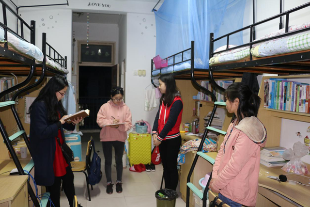 在对班级男女寝室进行走访的过程中,张雁老师与同学们进行了亲切的交谈,谈话中提到由于公司近期发生寝室不安全隐患问题,提醒大家寝室安全隐患一定要清除,违规电器一定不能使用。之后谈到寝室卫生问题,表示寝室是四位同学共同的家,卫生情况大家要一起关注,把寝室建成干净温馨的小家。提到男生要在学习生活上主动一点,多与女生们进行交流,增强班级凝聚力,同学间相处要融洽。最后,老师询问了同学们学习生活情况,并表示对同学们有着很高的期待,勉励同学们要抓好学业,为以后的考研或工作做好充足的准备。