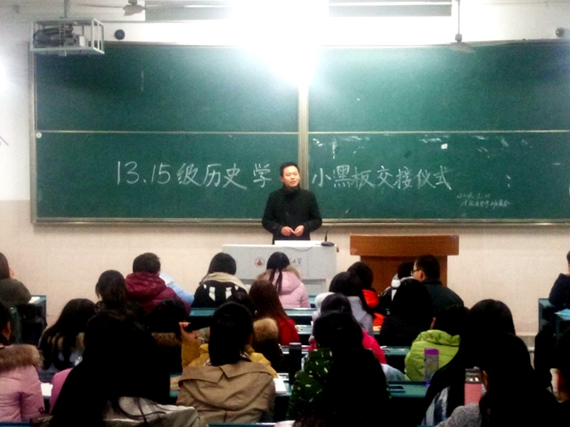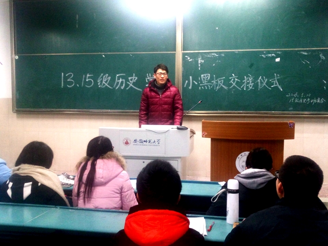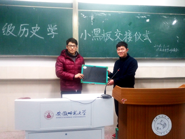 (本网讯、15历史黄冰、李蒙)春风三月送暖来,历史互助爱心传。为了响应雷锋月勤俭节约的号召,本着“加强师范生专业技能,传播历史学互助精神”的宗旨,13、15级历史学专业员工于2016年3月10晚7点在2050102教室进行师范生板书专用小黑板交接仪式。辅导员金捷和13级历史班长叶枫应邀参加。