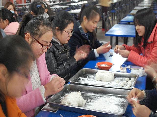 下午两点半,同学们陆续来到二食堂二楼。虽然没有节日里火红的灯笼,也没有身旁家人的陪伴,但相聚起来的人群逐渐使氛围热闹了起来,如同家一样温暖。人员到齐后,在食堂阿姨手把手的示范和亲切的指导下,大伙儿洗好了手,分好了组,撸起了袖管,围成了圈就“有模有样”的包起了汤圆。开始时同学们手法还有些生疏,但很快,一个个圆溜白净的汤圆出现在了托盘上。包汤圆的现场热火朝天,大家有说有笑,轻松而又投入,有的互相串串“显摆”劳动成果,或是拿出手机拍照和远方的亲人分享。