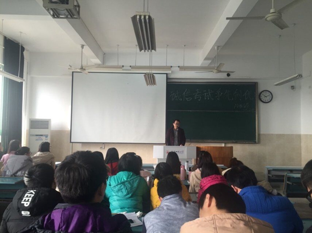 宫老师首先就考试违规违纪现象做出举例说明,并及相关的处罚规定做出了详细的解释。一例例发生在我们身边的违纪事件,引起大家的警觉,更能让大家恪守规则。同时宫老师也劝诫大家不要因为考试成绩不理想就采取不正当的竞争关系,更不要对考试作弊抱有侥幸心理。最后鼓励大家在接下来的一段时间里,恢复好心态,做好复习工作,争取考个好成绩。诚信考试是一个老生常谈的话题,每一次期末考试都会为此开班会,如此反复强调,只是希望大家能加强自我管理,自我教育,恪守考场考纪。