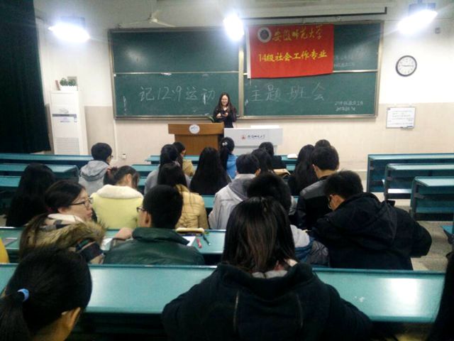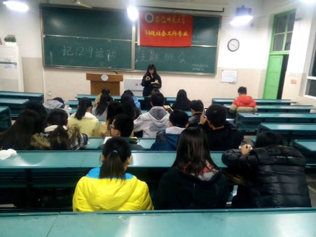 为了让同学们铭记历史,缅怀先烈,继承革命先烈敢为人先的无畏精神,2014级社会工作班级于12月5日晚7点在2050101教室召开以“纪念一二·九运动”为的主题班会,会议由宣传委员主持。14级社会工作班级员工参加。