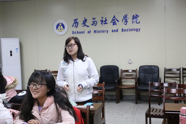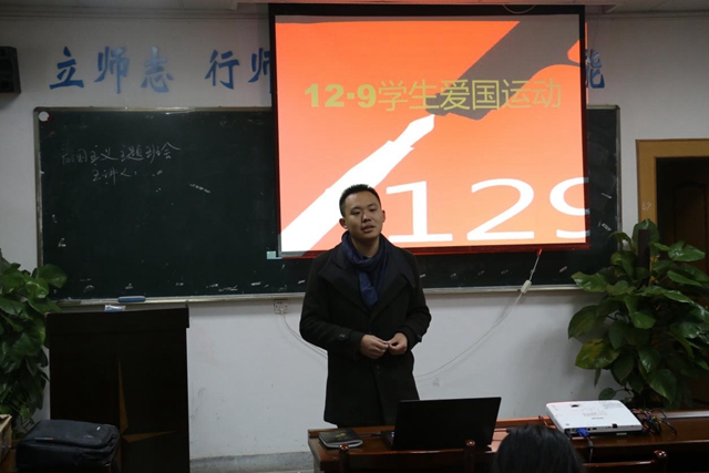晚7点30分,班会正式开始。一张红色为底色、代表员工的白色钢笔与代表反对政府的黑色枪头对峙的PPT映入眼帘,迅速将大家拖进那段风云历史。首先,金捷辅导员上台致辞,以自己的经历为例向大家讲述了青年时期的爱国故事和见闻,引发了同学们思考。接着,杨玉城上台进行宣讲,他从“何谓一二九”、运动背景、运动经过以及历史意义四个方面介绍了“12·9”运动始末,并且利用PPT图文并茂的宣讲方式,期间还穿插着振奋人心的《毕业歌》渲染氛围,增强宣讲效果。其后,杨玉城从自身出发谈及自己平常的爱国小行动,李姝萌同学也和大家分享了对爱国的感受。