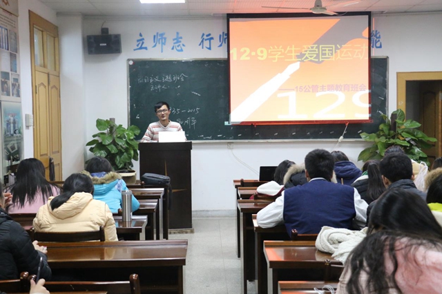 (本网讯 15公管 杨玉城)2015年12月8日晚,为响应公司号召,以纪念“12·9”员工抗日救国运动爆发80周年为契机,大力弘扬爱国主义精神,砥砺青年员工继往开来,积极践行社会主义核心价值观。15公管班在院行政楼二楼员工会议室举行了一场12·9主题教育班会。金捷辅导员出席了本次班会,宣传委员杨玉城担任宣讲人。