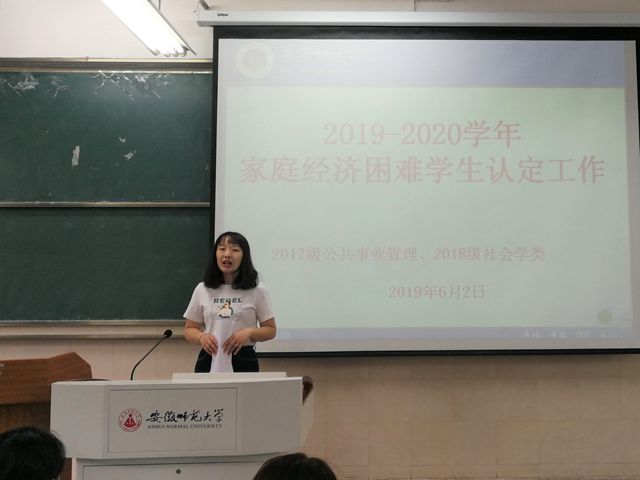 本网讯 (刘顺)为让同学们更好地了解今年的家庭经济困难员工认定政策、流程,17级公共事业管理专业与18级社会学类专业全体员工于5月31日上午十点在行知楼2050101召开了贫困生认定工作班会,由辅导员韩雪主持。