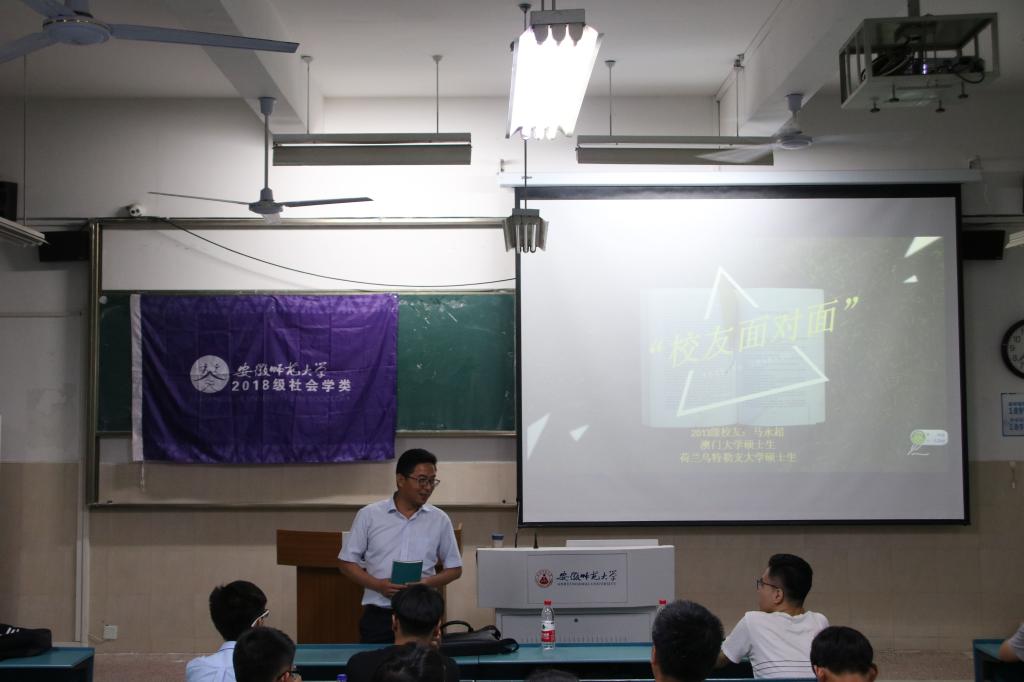 本网讯(王玲 周风)为帮助班级同学掌握社会学专业的学习路径、走出学习误区、更好地规划自身的学业和职业发展,2018级社会学类特邀请2013级社会学员工、澳门大学社会科学硕士、荷兰乌特勒支大学理学硕士马永超作为本次员工面对面的主讲,进行面向社会研究前沿的学习路径的经验分享。本次分享会于6月11日晚七点在2050101进行,专业主任路幸福、员工马永超以及18级社会学类全体同学参与此次活动。