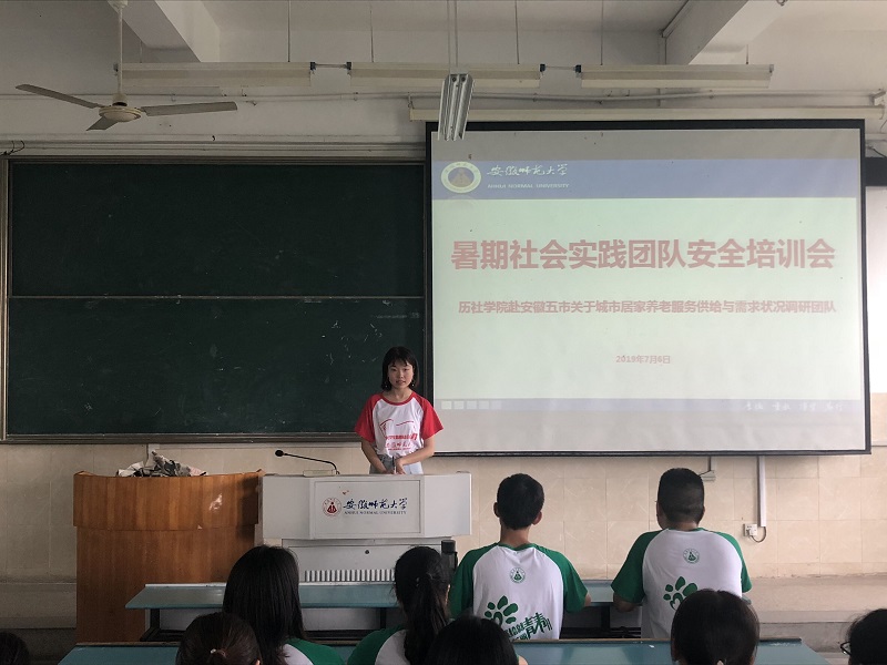 之后,刘蓉婕队长就本次社会实践的行程向大家做了简要介绍。本次社会实践调研社区的主阵地在芜湖,其中实践调研得到了公司以及民政局相关部门的关心和支持。此外,实践团队还将分批分别奔赴马鞍山、铜陵以及合肥、淮南相关社区进行实践调研,以获取更多更具有代表性的样本数据,提高本次实践调研数据的真实性,广泛性和代表性。
