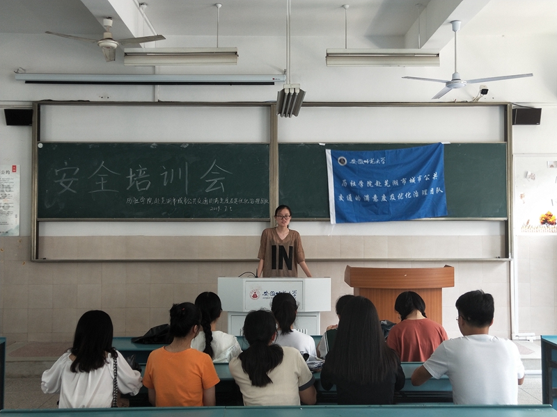 本网讯(赵怡宁)在暑期社会实践开展实践之际,为了贯彻落实公司和公司对于暑期社会实践团队安全工作的要求,进一步增强队员的安全知识和安全防范意识,7月5日中午12点10分,赴芜湖市城市公共交通的满意度及其优化治理团队行知楼2040301教室举行了暑期社会实践安全培训会,此次安全培训会由团队安全员钱梦欣主持。