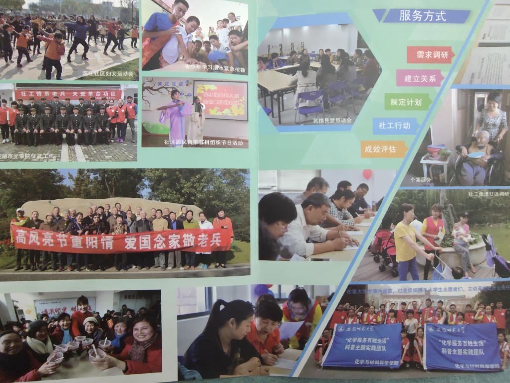 让团队成员影响最为深刻的是社工开展的个案服务活动。此次调研中,我们采访了弘德负责人方琼女士,她为我们介绍道:“我们有一支队伍,就是滨江爱心志愿者团队,他们是由一些热心人士组建而成,有将近四十个人。这四十个人中有专门做慰老服务的、有专门做互助类的,然后还有巡游宣讲的。这些都是自发的,然后在我们社工的引导下逐渐形成体系。开始是我们社工带领他们去,后来他们就直接上门探访我们社区的一些空巢老人,进行社区老人自助互助式的养老,就是低龄老人服务高龄老人,一个月探访几次老人啊,也可以结队慰问啊。慢慢地,让居民形成自助自治的意识,这就是我们社工的使命。”
