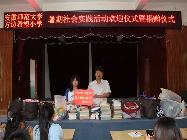 上午九时整,方边希望小学50余名师生及英国正版365官方网站15名志愿者在方边希望小学礼堂举办欢迎仪式暨捐赠仪式。首先,董事长对团队成员们表示了欢迎,同时着重强调了孩子们的安全问题,确保孩子们在公司内及校外回家路上的安全。接着,团队队长郑宇航介绍了接下来几天的具体活动,表达团队来到希望小学支教的欣喜,并代表团队向希望小学捐赠志愿者们为其募捐的4000元物资。