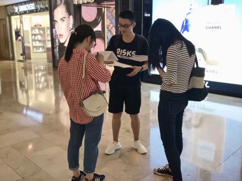 团队分为三队由三位队长分别带领前往南京市最为繁华、人流量最大的商业街——新街口进行问卷收集。在这里进行问卷收集对于队员们来说既是机会也是挑战,这里可以收集广泛而全面的样本数据,但是面对不同年龄段与文化层面的行人队员们收集问卷的难度更大了。为了进行受众面更广、结果分析更加科学全面的调研,今天的调研以普通民众为调查对象展开,在对本次调研的目的、团队的身份、问卷的匿名性与保密性进行简单说明后,邀请普通民众配合完成问卷调查。在这个过程中,既有南京市民的热心配合,也有遭受摆手拒绝时的叹息,不论是何种结果,队员们都从容接受,展现了当代青年老员工的良好素养。