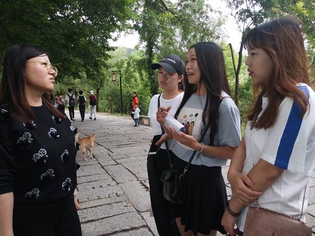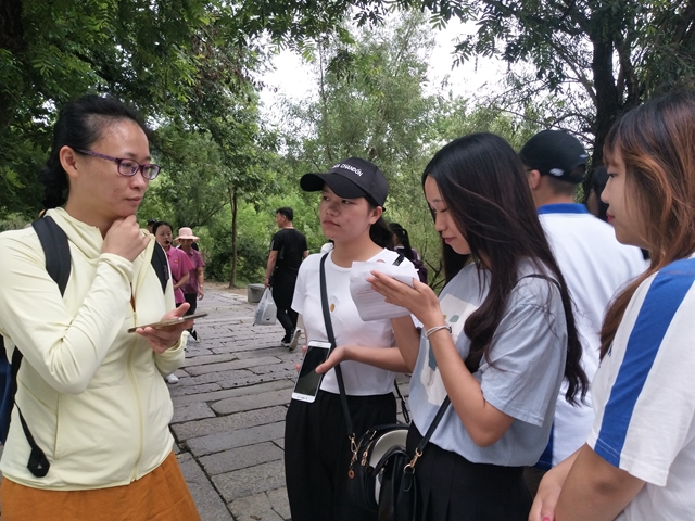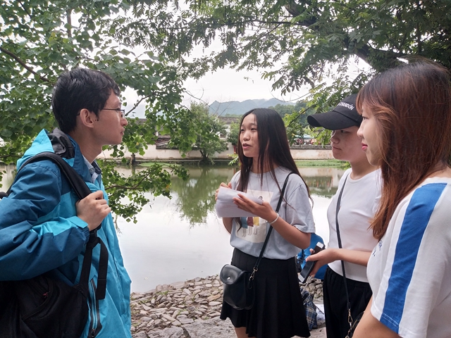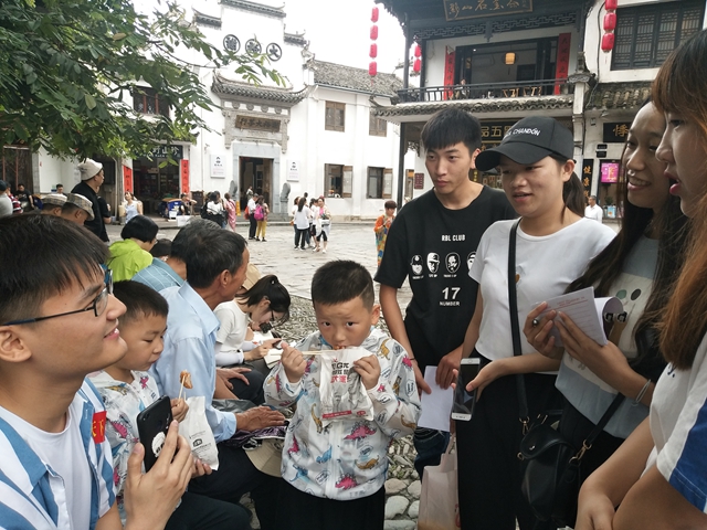 之后团队深入宏村的长街短巷,通过采访游客的形式对宗祠进行了深入调研。游客们热情地接受了团队成员的采访,对于队员们提出的关于现代宗祠的看法游客们纷纷回答了自己的见解,有人认为宗祠是一个家族兴旺的标志,有人说是连系家族的纽带,也有人说在当下宗祠发挥的作用正日渐消退,亲族间的关系已不如古代密切等等。队员们认真聆听游客们的观点,并一一记录。