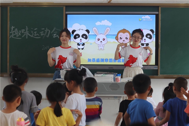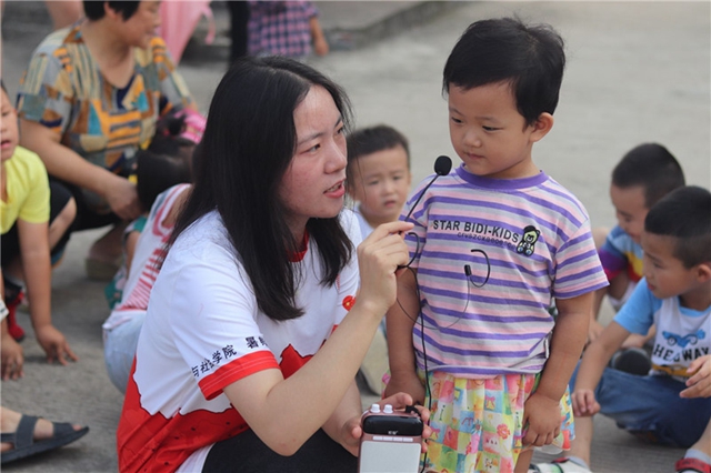第三天的授课主题是:“故事会”和“趣味运动会”。上午7点半,队员们已经全部到达教室,做好课前准备等待孩子们到来。当指针指向八点钟时,孩子们已经坐满教室。年龄稍大的孩子将他们带去隔壁教室辅导作业,年龄较小的孩子则坐在教室中参加“故事会”。首先,由队员王文静在多媒体上放出四个选项,请小朋友举手进行选择并观看相应的动画片,每一则动画片都由队员精心挑选,富有教育意义而又充满童趣。动画片结束后,请小孩子举手回答从这则动画片中学到的知识以及感想,并且可以联想到生活中的哪些故事,在这过程中,队员王文静一直引导孩子们进行逻辑思考。最后,由队员王文静对这四个动画片中的教育内容进行总结。