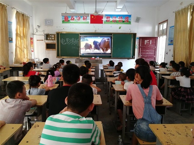 早上7点半,队员们已经布置好教室,并准备迎接可爱的孩子们。8点上午的课程开始。首先,队长为孩子们播放电影《公牛历险记》,电影结束后,队长邀请孩子们举手回答自己的感想,最后,队长对这个电影讲述的故事进行概括。该影片讲述了西班牙一头公牛的爆笑历险故事,其中充满了童趣可爱与温暖智慧,旨在通过运用线上与线下相结合的教学方式,让孩子们在观看影片的同时能够学习其中人物善良勇敢的优秀品质和提升孩子们交流学习的能力素养。