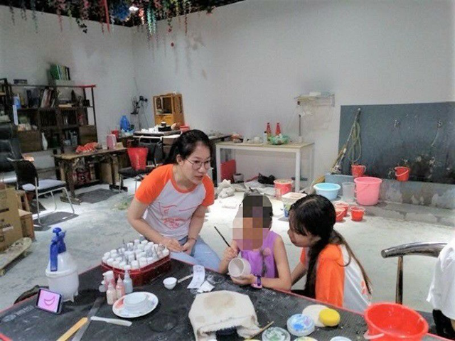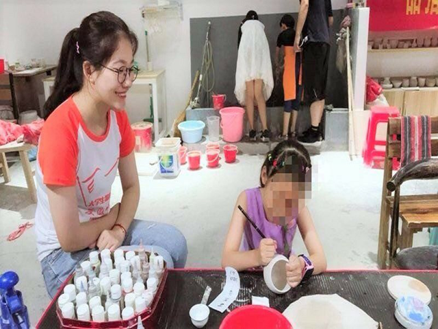 7月9日中午12点40分,我们到达了活动开展点。这个陶瓷手工馆是一位社会工作协会的成员开设的,为活动的顺利开展提供了场地。我们先与服务对象进行简单了解,稍作休息和参观后,13点活动正式开始。因为常驻志愿者和孩子之前已经参加过这个活动,陶瓷的手工胚已经烧制完成,所以今天的活动是在陶瓷手工胚上画上自己想画的图案,进行上色,最后烧制。小贾认真听老师讲解上色技巧,并了解注意事项。随后我们陪着小贾绘画,尝试轻叩她的心门,缩短心与心的距离。