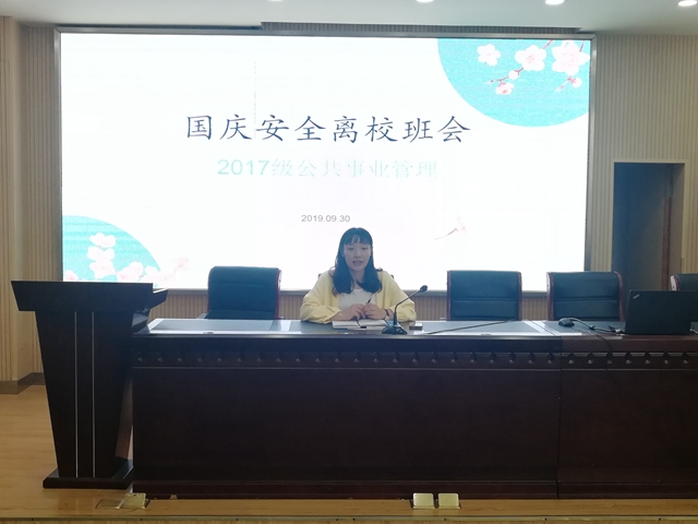 本网讯 (严文雯)为增强员工安全意识,做到有序文明安全离校,2019年9月27日下午,历史与社会公司2017级公共事业管理专业和2018级社会学类专业先后在辅导员韩雪老师主持下,于公司二楼报告厅召开了国庆安全离校主题班会。2017级公共事业管理专业和2018级社会学类专业全体同学参加班会。