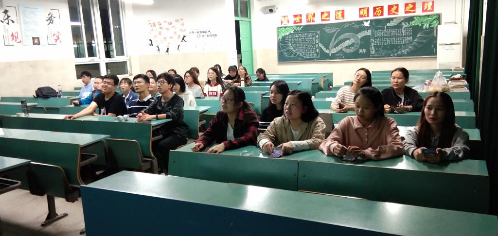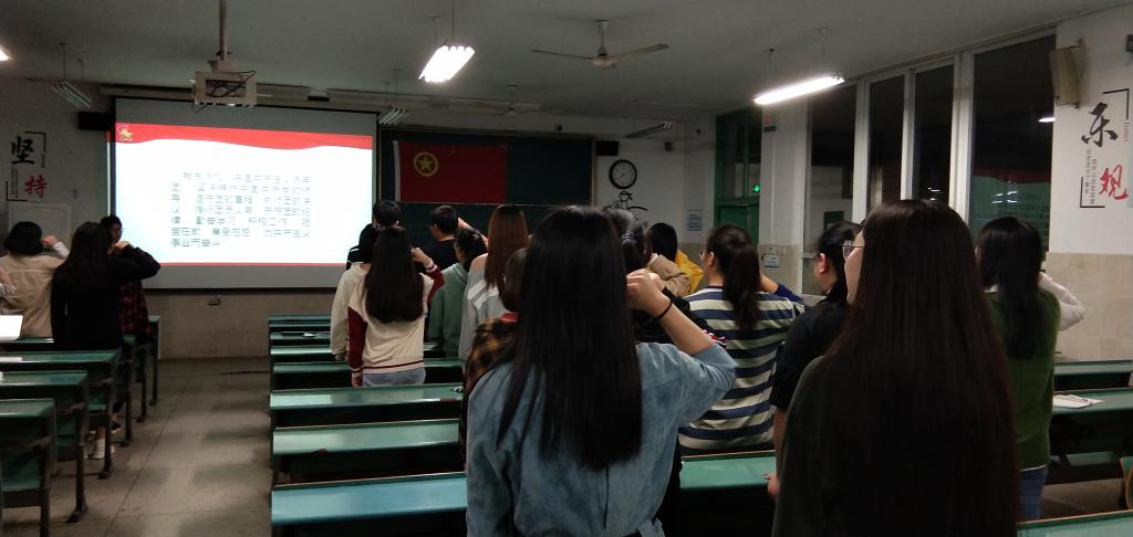 本网讯 18世界史刘佳闻)不忘初心,继续前进。为进一步加强团员的爱国情怀,10月20号晚上,18级世界史在行知楼2010602教室举行本学期首次团日活动,团日活动由团支书邵梅主持。本次团日活动的主题是“我与祖国共奋进国旗下的演讲”。首先大家齐唱国歌和团歌,充满旋律和激情的歌词回响在教室,歌词所蕴含的情感也随着歌声而在内心久久不能忘却。然后,由由副书记刘佳闻同学带领所有团员重温入团誓词, 勤奋学习,吃苦在前,享受在后。