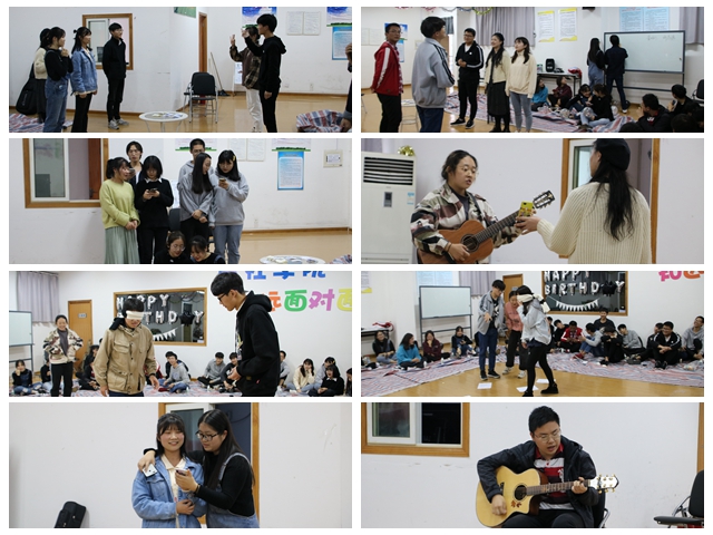 生日会第一项,你划我猜。比赛一声令下,同学们开始了一个又一个“精彩”的比划,让猜词语的同学实在摸不着头脑。但也有团小组又快又准,看得人真的是心服口服。最终第四团小组夺得桂冠。第二项活动是每个团小组依次表演节目。首先登场的是由第六团小组带来的歌曲《我和我的祖国》,体现了“社会人”的爱国情怀。接下来是刘艺明带来的孙燕姿的《克卜勒》,她那舒缓而温暖的吉他弹唱给同学们送上了最好的生日礼物。第三位出场的是李媛媛和付秋玉带来的歌曲《遇见》,因为遇见才有如今的我们。接着表演结束,又来到了游戏环节。本场游戏为蒙眼向前走。经过三轮精彩比拼,最终获胜的小组是第四团小组。游戏玩的嗨皮不断,精彩节目也不能落下。接下来是由第五团小组带来的朗诵《一切》。小组成员满怀深情的朗诵为我们带来了精彩的一幕。而后是田迪带来了吉他弹唱《鼓楼》,悠扬的音乐久久不散,将活动氛围推向高潮。所有的游戏和节目结束后,到了本次生日会的重头戏-生日蛋糕的出场。周风把蛋糕推出来后,由辅导员为过生日的同学分蛋糕,同学们吃的不亦乐乎。生日会在最后的合影留念中渐渐落下帷幕,班委们组织打扫活动场地,做好清扫工作。