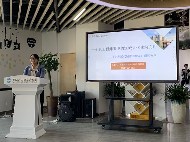 活动伊始,祝凤霞老师通过PPT的形式,为同学们详细地介绍了由葛立三老先生撰写的《芜湖近代城市与建筑》一书,讲解了芜湖市的近代城市建筑风格的发展与变迁。祝老师不时地在专业性知识讲解中穿插一些有趣的小故事,不仅活跃了现场气氛,而且激发了大家对芜湖建筑的兴趣。随后,来自公司团委的梅立浩、徐凡和李双雨同学,分别讲述了自己的一些感想和心得体会。梅立浩结合自身历史专业的特色,认为将历史建筑与现代元素结合,培养市民的文化归属感势在必行。李双雨从近代建筑风格的形成出发,立足当代老员工的视角,谈了对于历史遗迹的保护。徐凡则指出文化是城市的灵魂,建筑是城市的表征,并呼吁大家要对历史建筑保持敬畏之心,并对珍贵的历史建筑加以保护和传承。
