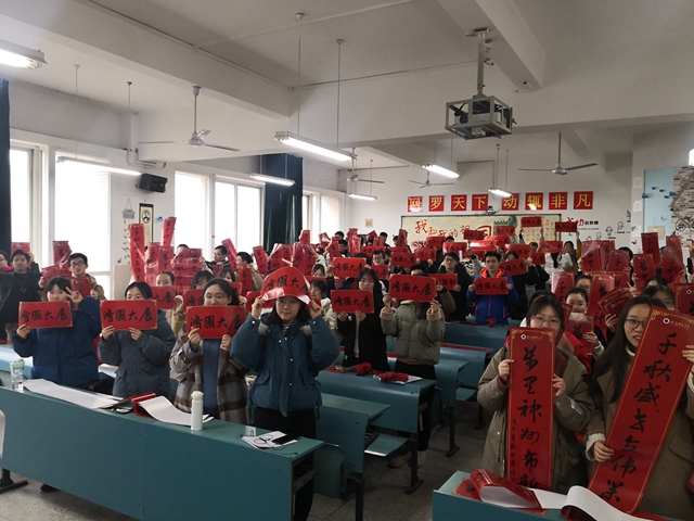 班会最后,宫老师给大家发放了由著名教授书法家庄华峰老师撰写的新春对联,“千秋盛世立伟业,万里神州布新风”,象征着师生们对强盛祖国的祝福和赞美。