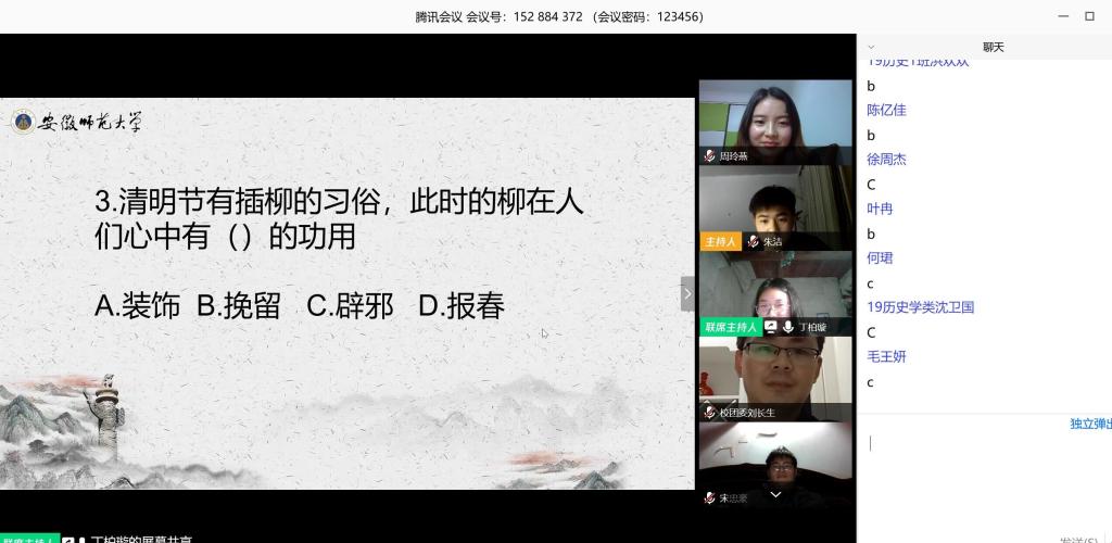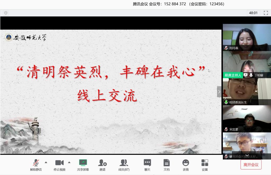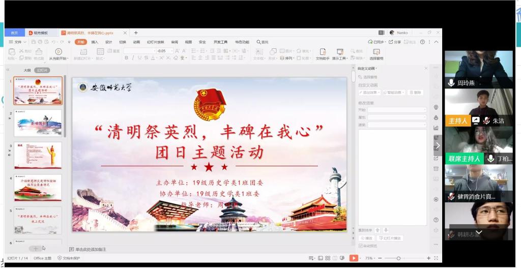 (本网讯 刘燕杰)为哀悼因新冠疫情牺牲烈士逝世同胞,祭奠先烈,同时激发团员们学习英烈们的奉献和牺牲精神,4月4日清明节晚历史学类一班开展了一次以“清明祭英烈,丰碑在我心”为主题“致敬、追思、缅怀、前行”的主题团日活动。本次线上团日活动由辅导员周玲燕老师的指导下开展,并荣幸邀请校团委副书记刘长生老师出席;会议由团支书朱洁主持,全班同学参与。