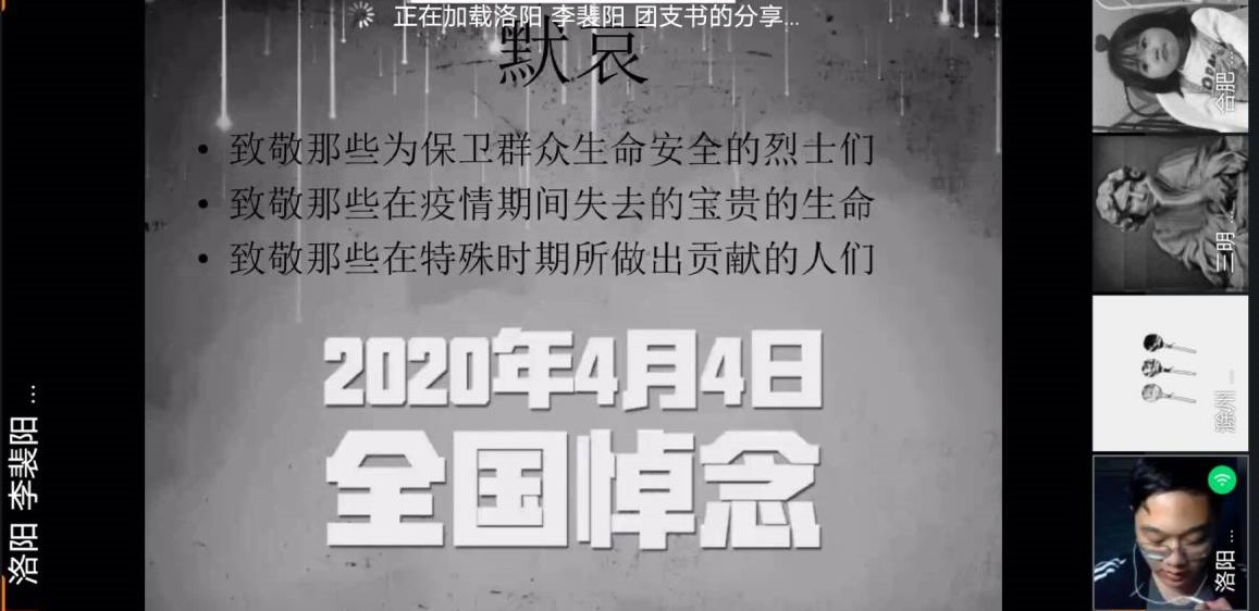本次团日活动开始时,班级团委号召同学们通过网上祭扫的方式缅怀先烈,该方式新颖,也可以很好的表达缅怀之情,引发了较高的参与度。之后,由团支书李裴阳主持展开了线上团会,团会开始大家集体默哀三分钟,为新冠疫情牺牲烈士和逝世同胞表示深切哀悼,接着由李裴阳同学对此次活动背景进行简要阐述。