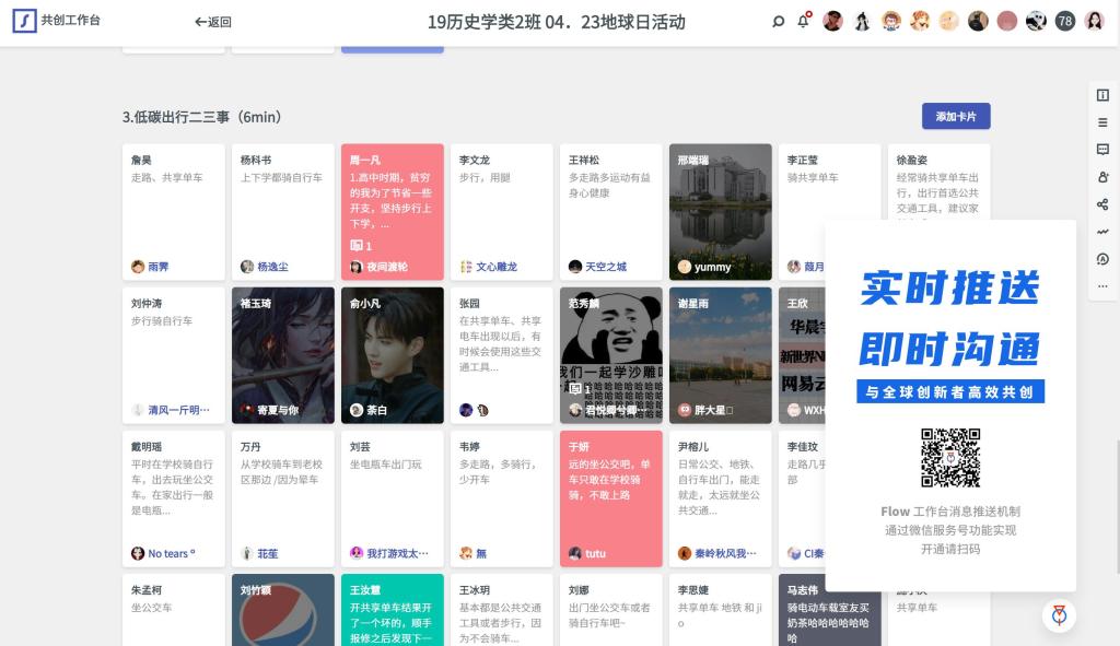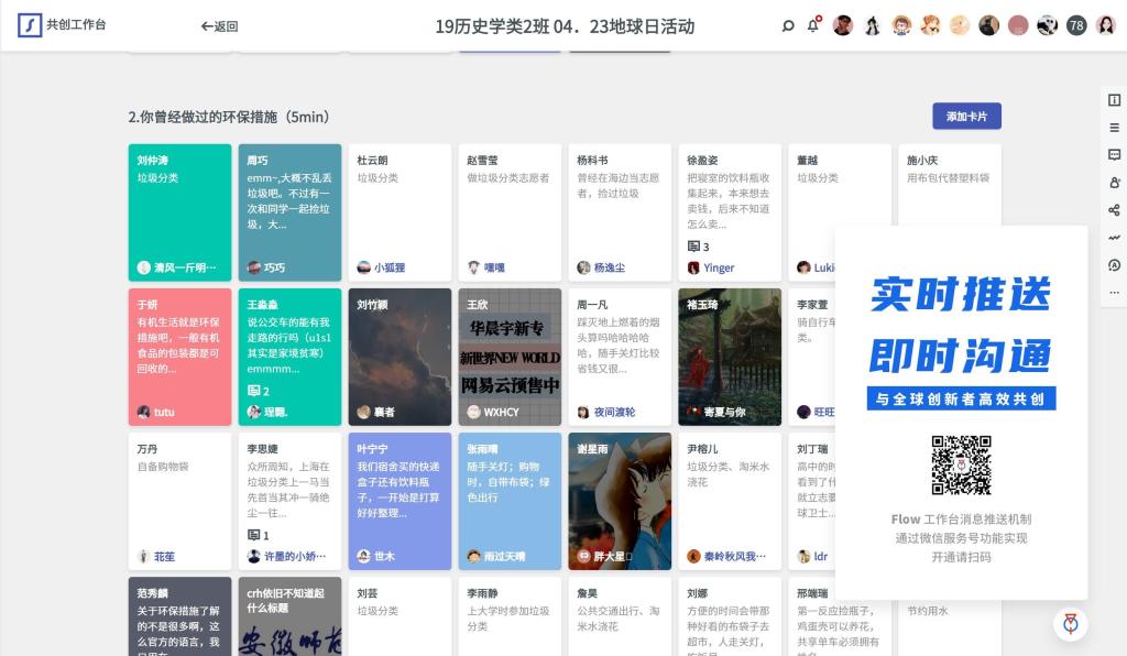 活动开始,由主持人何宇立同学开场,交代活动背景及主题等。接着在前期设计的FLOW共创平台上发布话题,引导同学们分享自己的相关经历。本次活动的代表性话题有:“萌宠花草饲养指南”“曾经做过的环保措施”“低碳出行二三事”“你眼中的垃圾分类”等。