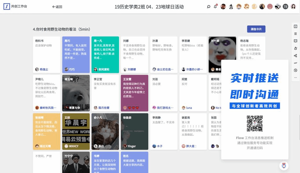 活动中,同学们根据共创话题,积极在Flow平台上进行分享自己的经历和感悟,有些同学还以语音通话的方式向班级同学们一同分享自己关于保护环境、饲养动物植物等的相关经历。分享中,同学们语言诙谐幽默,态度认真。活动过程中,除了Flow平台上的讨论,班级群聊的讨论也热火朝天。本次探讨同学们积极响应和热情参与,极大促进了班级凝聚力。