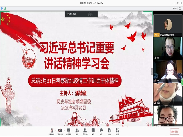在会议开始,主持人潘靖童通过视频分享,带着大家一起学习了习近平总书记重要讲话精神。讲话指出,要把医疗救治工作摆在第一位、打好群防群控的人民战争、加强力量薄弱地区疫情防控工作、保障好群众基本生活、形成同疫情防控相适应的经济社会运行秩序等重大问题,形成同疫情防控相适应的经济社会运行秩序和补齐治理体系和治理能力短板。结合习近平总书记发言文本内容,潘靖童逐条介绍了疫情期间中国的防控措施和应对措施,以及党中央对疫情严重地区的深切关心和大力支持,表达出对党和国家的高度敬仰之情。此后,委员代表喻仲元同学发表了自己的感想,“面对突如其来的疫情,中国做到了最及时有效的应对,从而降低了这次疫情对我国人民的伤害和损失,”并对中国在应对疫情下的临危不乱的行为和取得的有效成果表示赞同。会议最后由宫超老师总结讲话。宫老师指出,团委委员一定要端正学习态度,要始终保持良好的学习习惯,确保拿到优秀的学习成绩。而且,在认真学习工作的同时,还需要加强政治学习,提高自身的思想觉悟和政治素养,努力成长为德智体美劳全面发展的新青年。