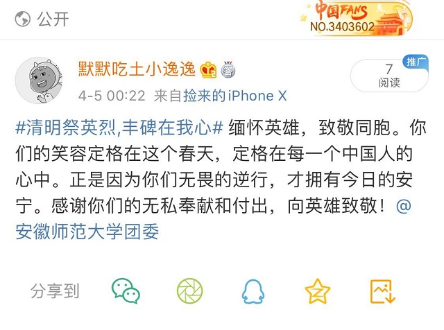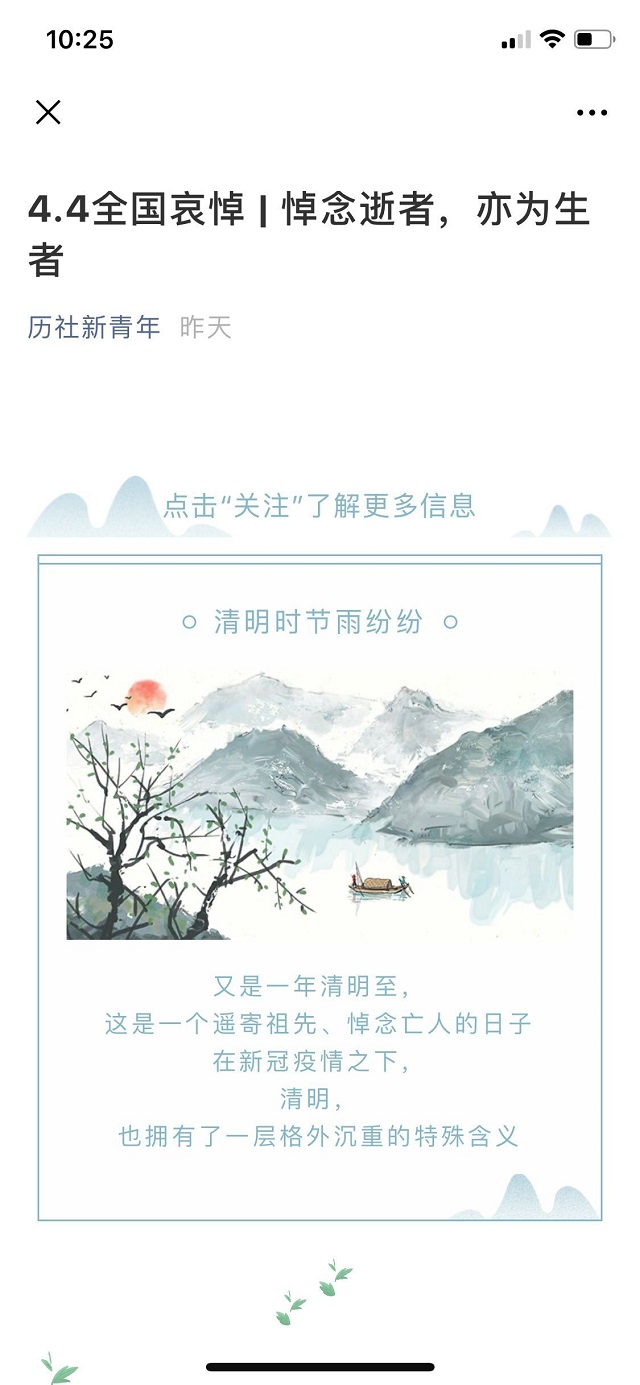 为引起同学们的重视,提高大家对抗疫英雄的认识了解,各班通过官方QQ号、官方微信公众号发布了相关的哀悼文章和纪念图片,以强化同学们对英烈先辈们的敬仰之情。公司新媒体运营中心在公司公众号“历社新青年”上发布了清明节微信推文;18级社会学类在班级微信公众号发表了一篇名为“‘清明祭英烈,丰碑在我心’2018级社会学类主题团日活动”的微信推文;19级公共事业管理和19级社会学类通过班级官Q发布了悼念英雄的文字和图片,同学们纷纷点赞留言。