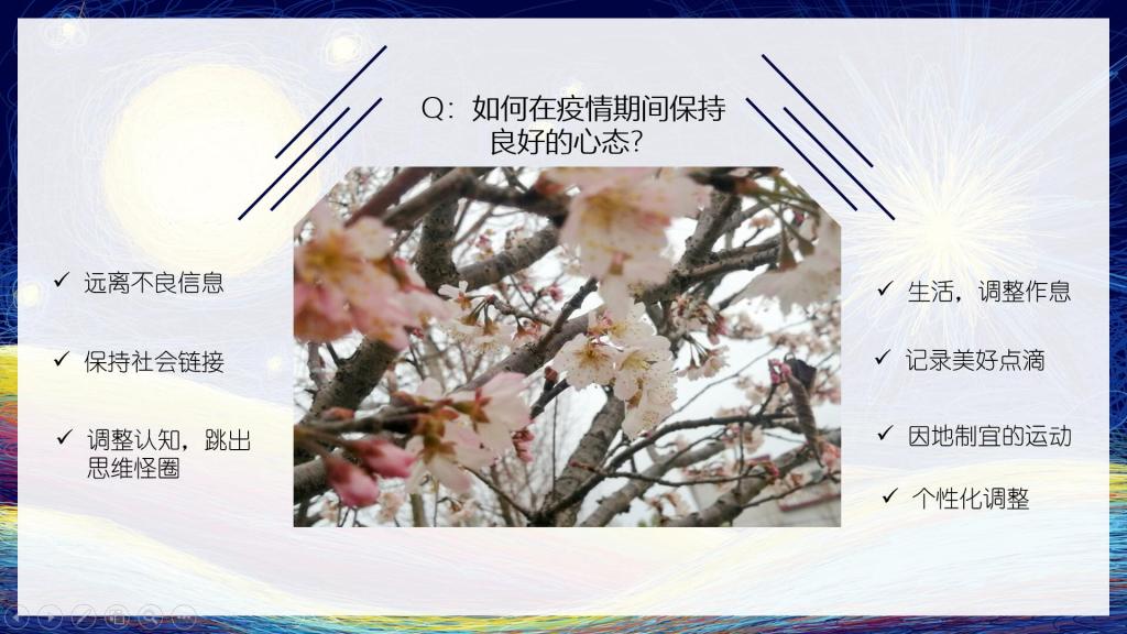 本次班会由四个部分组成,通过“战疫”、“特殊时段里的热爱”、“生活”、“平静日子里的热爱”四个主题突出重点。首先心理健康委员对抗击疫情的三个阶段进行总结,回溯了共渡疫情的艰难时光,并体现出中国控制疫情的“责任”、“守序”、“热爱”三大优势,同学们不由得赞叹中国政府的高执行力、高效率。
