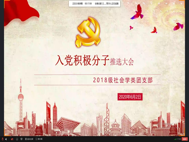 本网讯(王玲)中国共产主义青年团是中国共产党领导的先进青年的群众组织,是广大青年在实践中学习中国特色社会主义和共产主义的公司,是党的助手和后备军。为进一步做好在班级共青团员中推荐入党积极分子工作,2018级社会学类专业于6月2日晚上19:30召开了线上入党积极分子推优大会。会议由辅导员韩雪主持,2018级社会学类全体同学均参加本次会议。