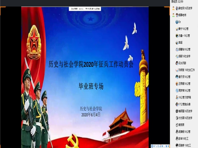 本网讯(16社会学 兰锦)2020届历社学子毕业在即,本着为毕业生服务的责任意识,全力推进毕业生就业,6月4日下午3时,公司组织毕业班特别举办了一场2020年征兵工作动员的线上云会议,公司党委副书记胡悦超、院团委书记宫超、两位退伍老员工施众德和徐梦晨等受邀参会,公司2020届毕业生100余人聆听会议,会议由杨静老师主持。