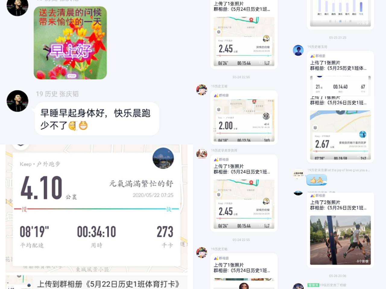 本次活动持续时间长,参与度较高。体育打卡从5月份至6月份,期间同学们每天坚持在班级群里发布运动截图,其中黄新雨、叶冉等同学每天早起锻炼,每次跑步4至5公里,在同学中起到了表率作用。在这些优秀同学的带领下,历史一班体育打卡活动于6月1日圆满结束,在这一个月期间,同学们锻炼了身体,强健了体魄,学会了坚持不懈,得到了许多意想不到的收获。