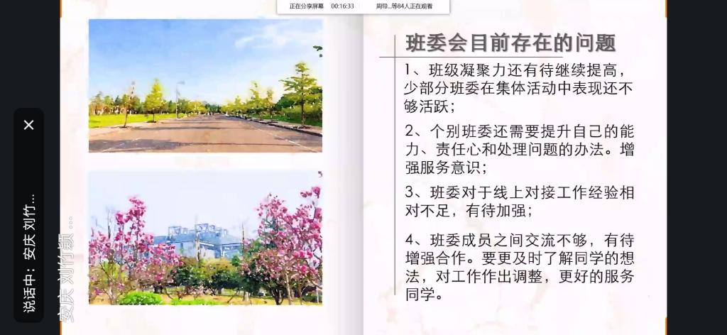 第二部分,班长刘竹颖总结本学期班委工作,并详细介绍班级建设的情况,从多维度介绍总结,不仅介绍班级建设建树,也提出班委会现存问题及解决方案,团支书李裴阳也通过回顾本学期工作和班级活动分享自己的收获和感悟,两位同学都提出美好展望,期待在班级建设中更上一层楼。