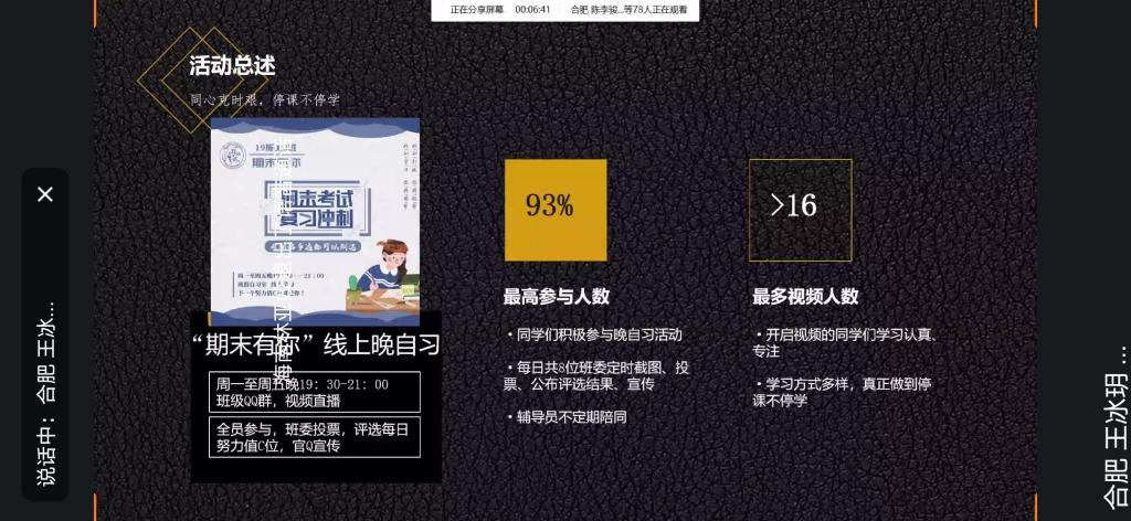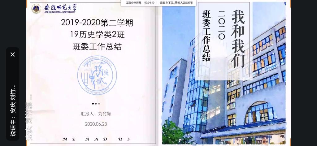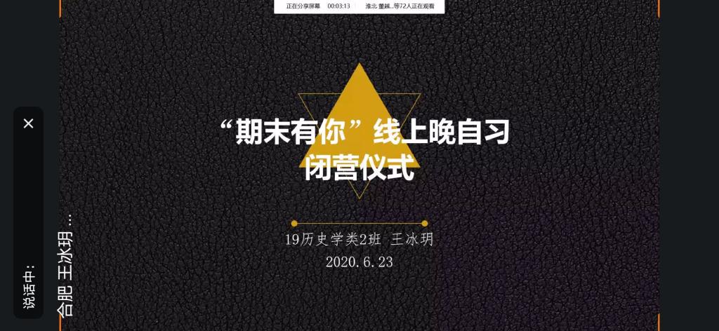 (本网讯 19历史2 叶宁宁 王冰玥)本学期接近尾声,为总结一学期的班级学习和工作情况,也为回顾半个月以来的“期末有你”线上晚自习特色活动,6月23日晚,历史2班举行了“期末有你”线上晚自习闭营仪式暨学期班委工作总结会,辅导员周玲燕老师及班级全体同学线上参与。