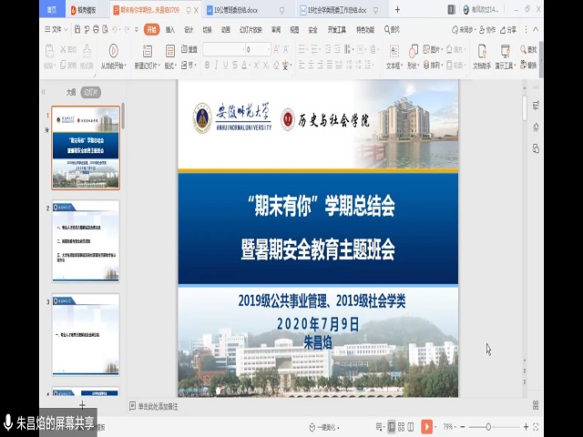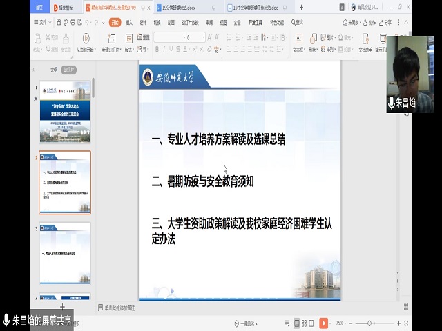 会议第一阶段主要针对于同学们的学习和人身安全方面。朱老师带着大家详细解读了专业人才培养方案,并结合大家近期选课遇到的问题,有针对性地进行了解答,提醒大家按照专业培养方案进行选课。接下来,朱老师从以下几个方面进行暑期安全教育,分别是疫情防护、游泳溺水、旅游外出、防汛防暑和勤工助学。最后,朱老师提醒大家要合理分配暑期时间,在放松的同时也要兼顾学习。