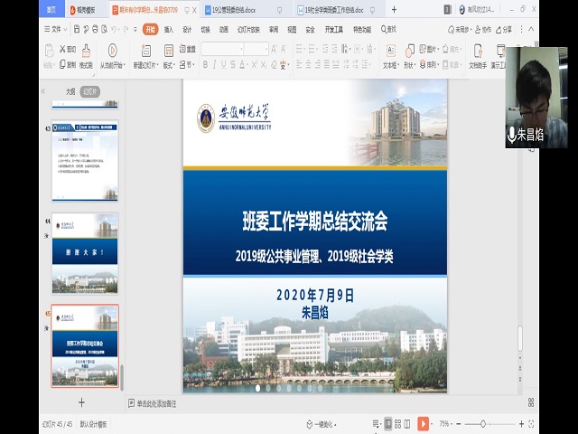 本网讯(李双雨)期末临近,为解答同学们学业上的疑惑、安排暑期事宜,并对班级工作进行总结,19公管和19社会类于7月9日晚19时开展了期末总结班会暨班委工作交流会。会议由辅导员朱昌焰老师主持,两个班全体同学参与。
